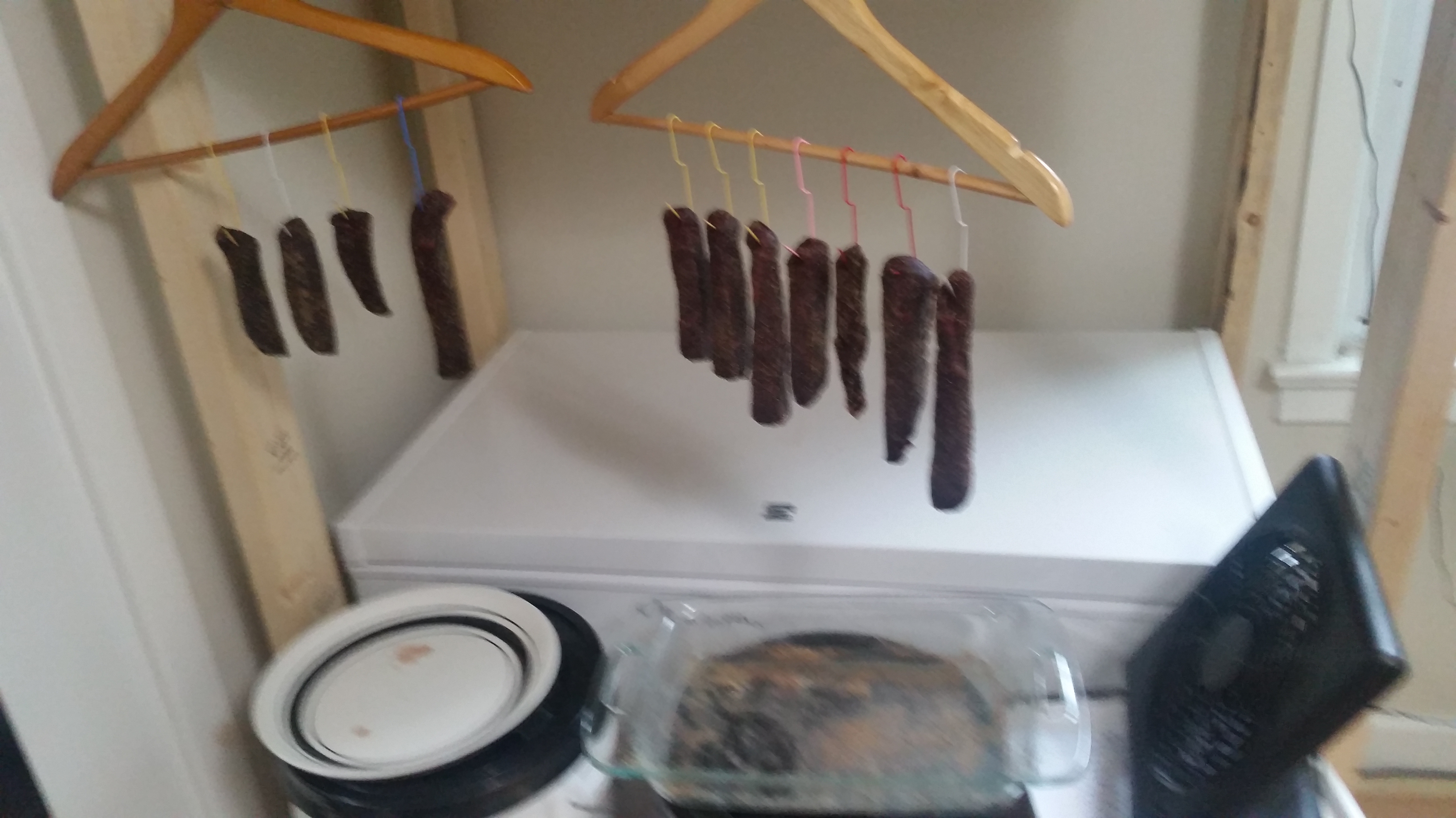 After the meat has been properly coated, you can either let sit in the fridge over night, or hang immediately. I waited overnight. Hang the meat on any sort of hook you can find, the easiest method is to unbend some paper clips. Hang them somewhere cool and dry, out of direct sunlight. If you are worried about pest or flying insects, you can either hang them in a cheesecloth/breathable bag, or have a fan blowing on them so flies can’t land on it. The fan has the added benefit of drying the meat out faster. I hung mine on paper clips with clothes hangers over drip trays, with a fan blowing on them in a shaded corner of the pantry.